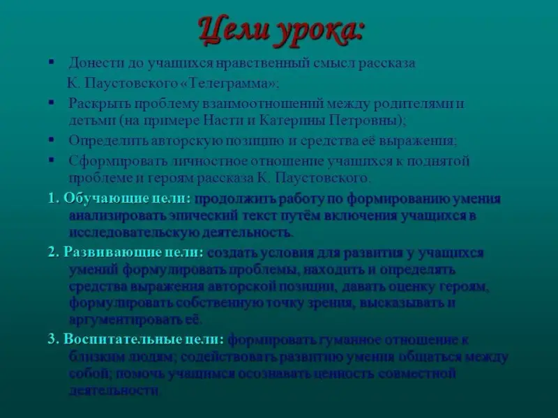 - Донести до учащихся нравственный смысл рассказа К.Паустовского "Телеграмма";