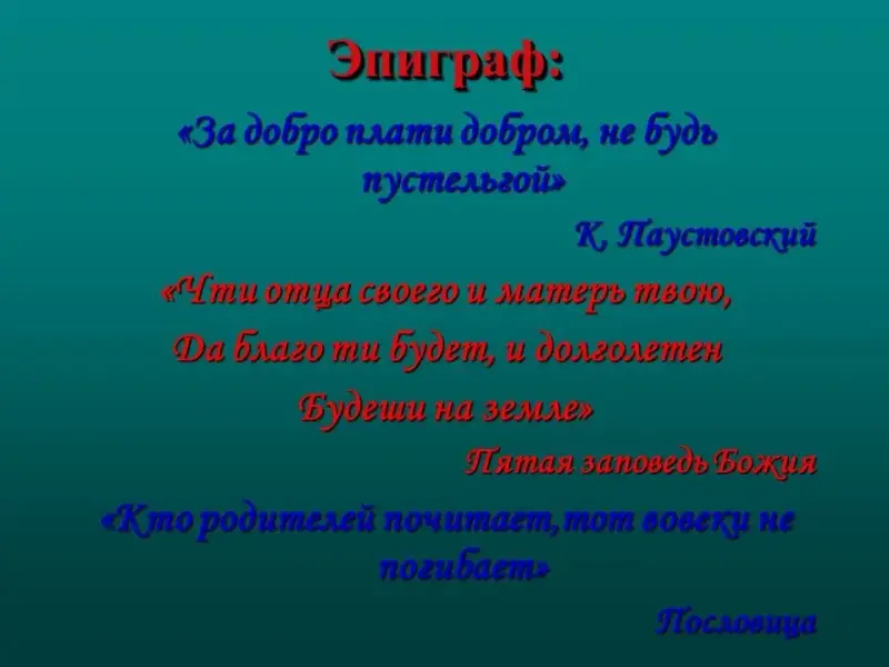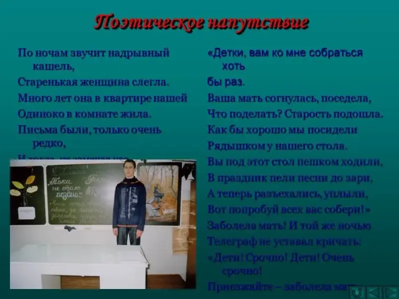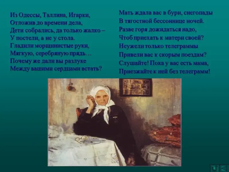 - Ребята, вы скоро станете взрослыми, получите образование, уедете далеко от родителей, возможно, не сможете их часто навещать - будут у вас свои интересы, неотложные дела, но наш урок мне хочется закончить поэтическим напутствием вам.