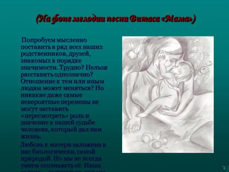 - Попробуем мысленно поставить в ряд всех наших родственников, друзей, знакомых в порядке значимости. Трудно? Нельзя расставить однозначно? Отношение к тем или иным людям может меняться? Но никакие даже самые невероятные перемены не могут заставить "пересмотреть" роль и значение в нашей судьбе человека, который дал нам жизнь.