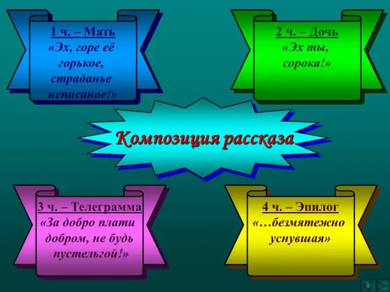 - Что такое композиция? Из каких частей состоит рассказ? (1-я часть - "Мать", 2-я часть - "Дочь", 3-я часть "Телеграмма", 4-я часть - Эпилог).