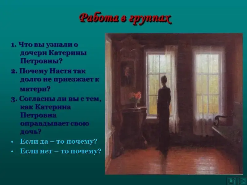 - Паустовский не рассказывает подробно о юности героини. По каким деталям читатель восстанавливает прошлое Катерины Петровны? (Катерина Петровна живёт в селе Заборье. Отец её - известный художник, дом "мемориальный", она "последняя обитательница" его. У неё нет никого родных, кроме дочери. Не с кем поговорить о картинах, о петербургской жизни; когда-то она жила в Париже с отцом, видела похороны Виктора Гюго - французского писателя. Добрая - страдает от одиночества, но не упрекает дочь; молча сидит на диване и сгорбленная, маленькая, всё перебирает какие-то бумажки в ридикюле; временами тихонько плачет, для неё ночи долгие, тяжёлые, у неё бессонница, не знает, как дожить до утра. Душевное состояние: одинока, разочарована, душевная боль, на переводах ощущает запах духов Насти, не теряет надежды на приезд дочери).