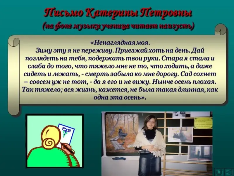 - Катерина Петровна решила не мешать дочери, и всё же в одну из ненастных осенних ночей она пишет ей письмо.