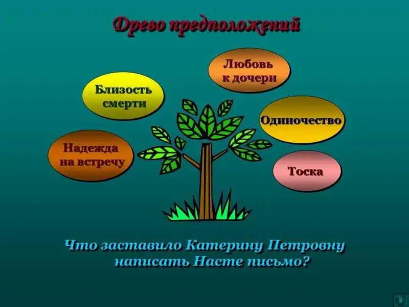 - Работаем в группах. Как вы думаете, что заставило Катерину Петровну написать Насте письмо? Свой ответ аргументируйте. (Учащиеся пишут на листах свои выводы, прикрепляют к дереву, обосновывают свой выбор). (Выступления - схема).