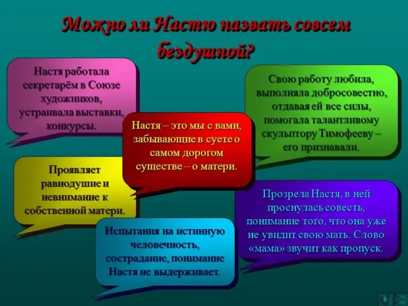 - Можно ли Настю назвать совсем бездушной? Вспомните, где она работала? Как относилась к своей работе? Кому помогала? (Настя работала секретарём в Союзе художников, устраивала выставки, конкурсы, свою работу любила, выполняла добросовестно, отдавая ей все силы, помогала талантливому скульптору Тимофееву - его признавали).