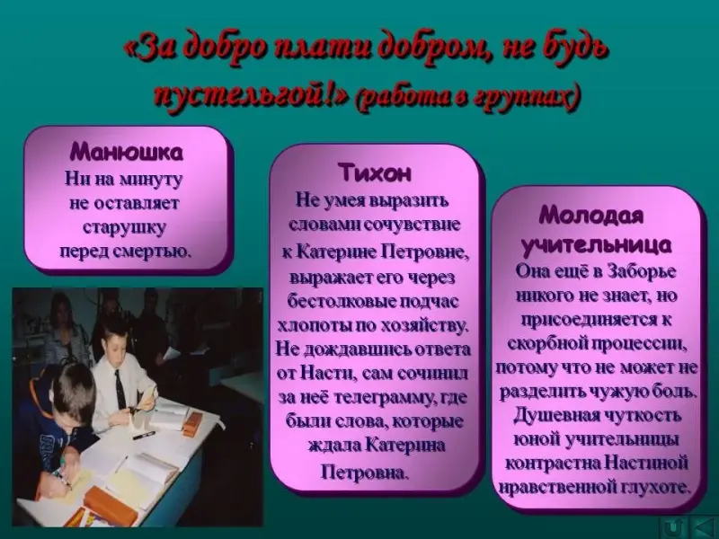 - Охарактеризовать: 1 группа - Манюша, 2 группа - Тихон, 3 группа - учительница.
