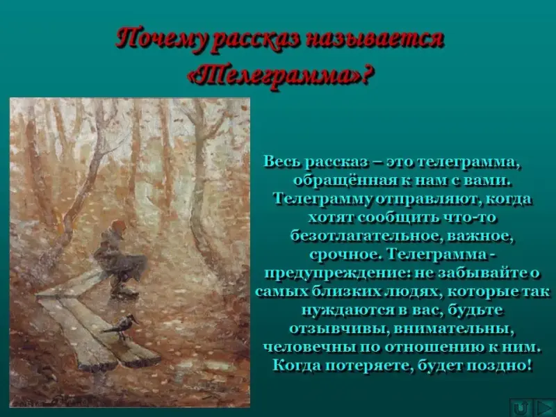 - Почему рассказ называется "Телеграмма"? (У заглавия - глубокий подтекст. Весь рассказ - это телеграмма, обращённая к нам с вами. Телеграмму отправляют, когда хотят сообщить что-то безотлагательное, важное, срочное. Телеграмма - предупреждение: не забывайте о самых близких людях, пока не стало поздно).