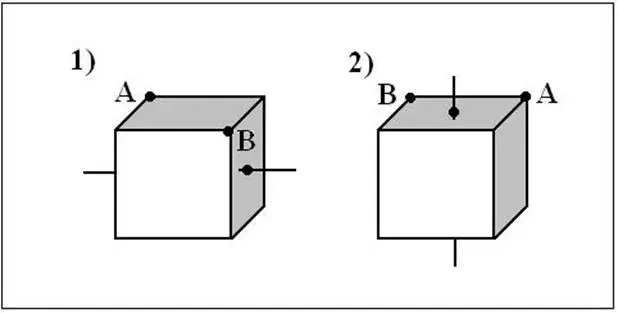 Задача № 3. Кубик с выделенными вершинами А и В (рис. 4а) насадили на ось, проходящую через середины противоположных граней, и повернули вокруг этой оси. Новое положение точки А отмечено на рисунке 4 б) с изображением того же кубика. Отметьте на втором рисунке новое положение точки В.