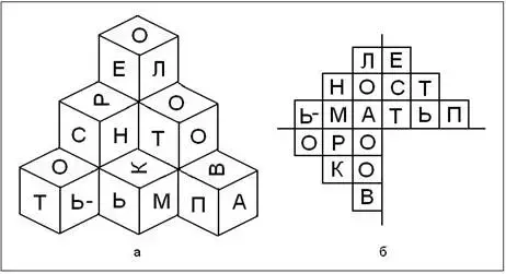 Задача № 8. Правильно изобразив сдвинутые между собой три прямоугольные проекции кубиков с буквами, прочтите русскую народную мудрость (рис. 10а).