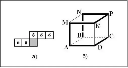 Задача № 7. Все кубики на рис. 9а одинаковы. Перечертите развертку одного из кубиков (рис. 9б) и нанесите не нее недостающие буквы.