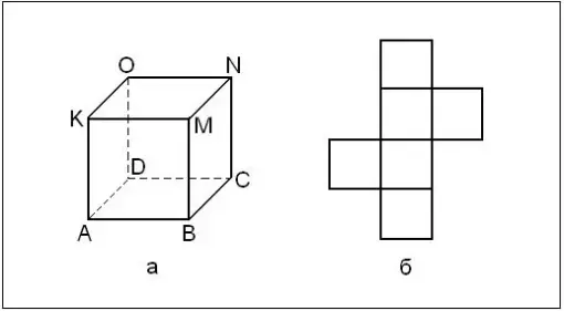 Задача № 4. На рис. 6а,б изображены куб и его развертка. Обозначьте на развертке точки, соответствующие вершинам куба А, В, С.