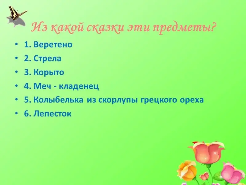 1. Волшебные предметы, исполняющие желания (волшебная палочка, лепесток, кольцо, волосок).
