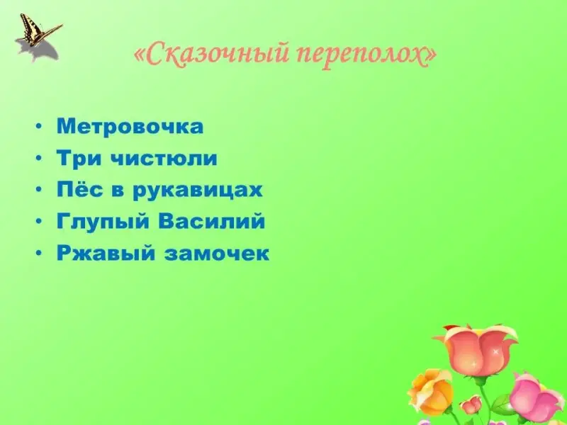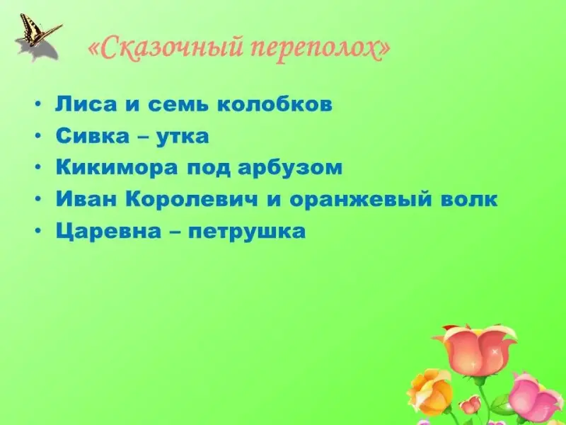 Ведущий. Перед вами названия сказок и сказочных героев. Но что-то в этих названиях перепутано. Перепутались названия сказок. Начался переполох. Царевна стала Хаврошечкой, Кощей - Ясным соколом. Не должно быть беспорядка в сказках. Вы должны исправить эти ошибки.