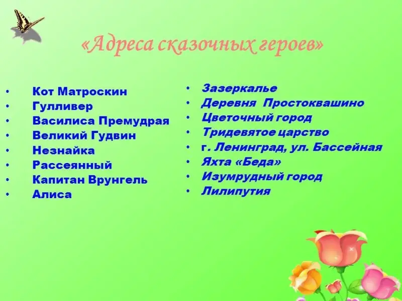 Капитаны должны помочь правильно написать адреса сказочных героев.