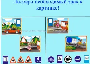 Задание оценивается за правильное выполнение. На интерактивной доске в верхней части экрана сюжетные картинки, в нижней части экрана дорожные знаки. Необходимо подобрать дорожный знак к сюжетной картинке, если знак подобран не верно, то он исчезает.
