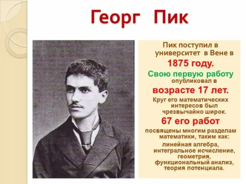 Георг Пик - австрийский ученый - математик. Пик поступил в университет в Вене в 1875 году. Свою первую работу опубликовал в возрасте 17 лет. Круг его математических интересов был чрезвычайно широк. 67 его работ посвящены многим разделам математики, таким как: линейная алгебра, интегральное исчисление, геометрия, функциональный анализ, теория потенциала.