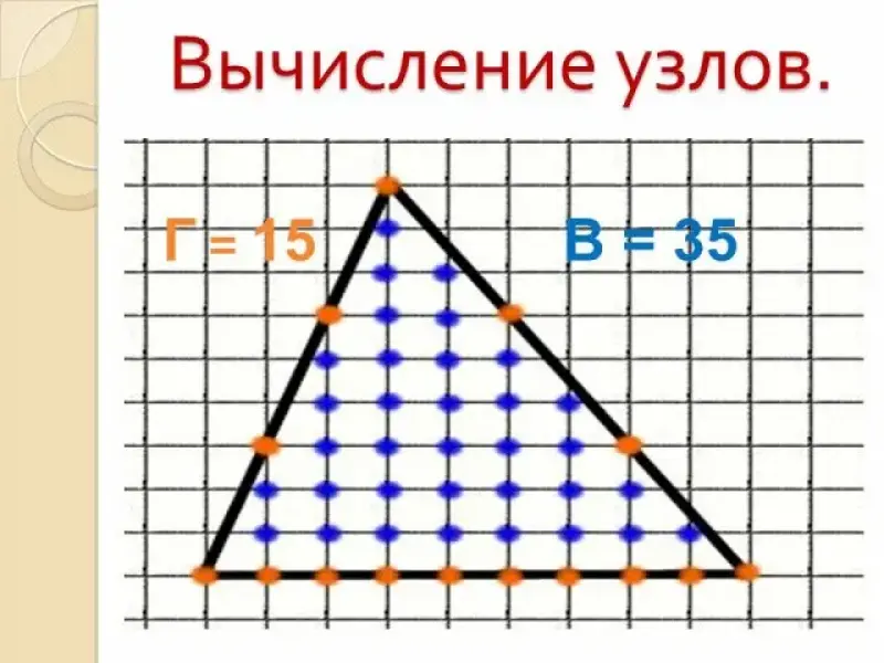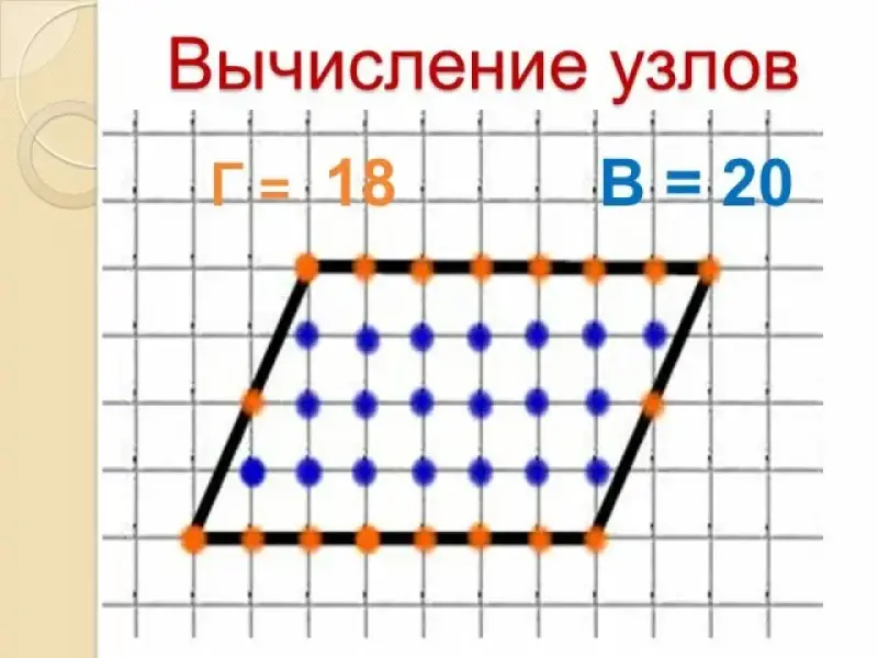 И еще один пример. Дан произвольный многоугольник. Считаем узлы на границе. Их 14. Узлом внутри многоугольника 43. Г = 14, В = 43.