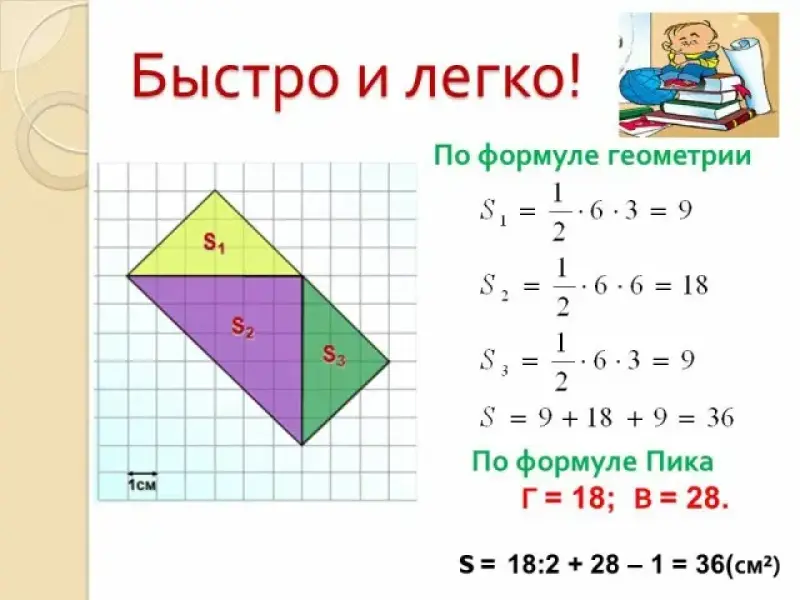 На рассмотрение пяти примеров мы затратили всего 1-2 минуты. Вычислять площадь по формуле Пика не только быстро, но и очень легко!