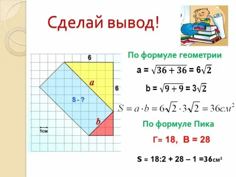 - Подставьте в формулу, назовите результат. Вы за одну минуту вычислили площадь.