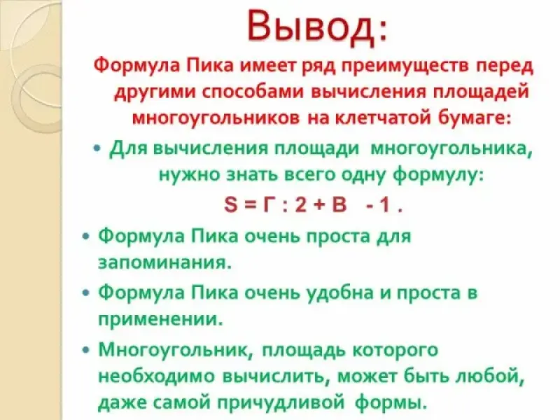 Итак, формула Пика имеет ряд преимуществ перед другими способами вычисления площадей многоугольников на клетчатой бумаге:
