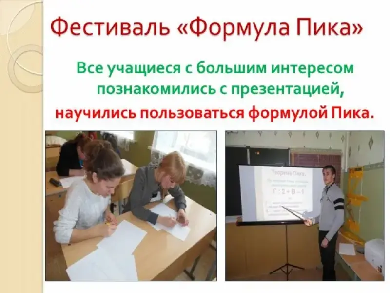- Провели для учащихся 9-11 фестиваль "Формула Пика", научили их находить площадь, использую эту формулу. Подобрали много интересных примеров.