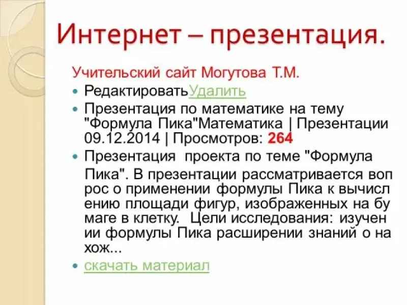Мы оформили альбом "Формула Пика". Им постоянно, особенно первое время, пользовались учащиеся нашей школы.