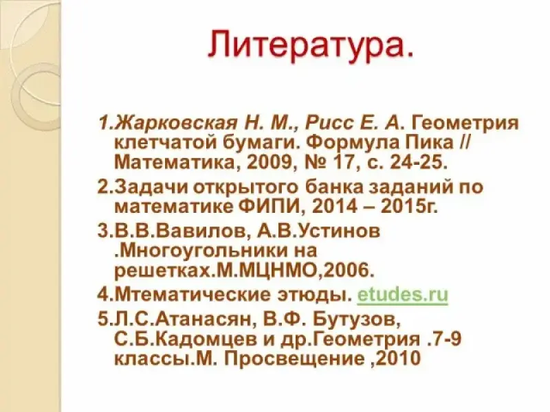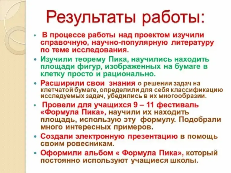 - Изучили теорему Пика, научились находить площади фигур, изображенных на бумаге в клетку просто и рационально.