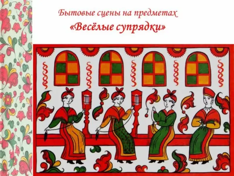 Особый интерес в пермогорских росписях представляют сцены народного быта. Трудно отыскать предмет, на котором бы не было какой - либо сцены с изображением деревенских посиделок, застолий, катаний на лошадях или крестьянского труда. <слайд № 5,6,7> Специалистам по народному искусству часто задают вопрос: стремиться ли художник данной сценой передать обычную деревенскую обстановку или же он умышленно приукрашает действительность, желая тем самым подчеркнуть торжественность момента? Вот как пишет в своей книге "Русская народная живопись" С.К. Жегалова: "Вспомним свадебные песни: в них деревенские жених и невеста величаются "князем" и "княгинею", а обычные сани именуются "каретою". Такой подчёркнутой праздничностью обстановки, яркостью красок народные художники старались не только подчеркнуть важность события, но мечтой о красивой, радостной жизни скрасить тяжёлую повседневность". Можно сказать, что главная тема росписи - это опоэтизированная жизнь народа и родной природы.