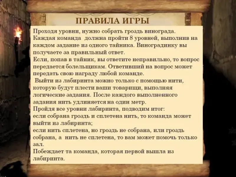 Правила игры: Проходя уровни, нужно собрать гроздь винограда. Каждая команда должна пройти 8 уровней, выполнив на каждом задание из одного тайника. Виноградинку вы получаете за правильный ответ. Если, попав в тайник, вы ответите неправильно, то вопрос передается болельщикам. Ответивший на вопрос может передать свою награду любой команде. Выйти из лабиринта можно только с помощью нити, которую будут плести ваши товарищи, выполняя логические задания. После каждого выполненного задания нить удлиняется на один метр. Пройдя все уровни лабиринта, подводим итог: если собрана гроздь и сплетена нить, то команда может выйти из лабиринта; если нить сплетена, но гроздь не собрана, или гроздь собрана, а нить не сплетена, то вам могут помочь только болельщики Побеждает та команда, которая первой вышла из лабиринта. А в помощь мы возьмем внимание, память, логику, смекалку. В путь! |