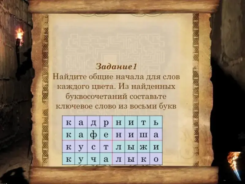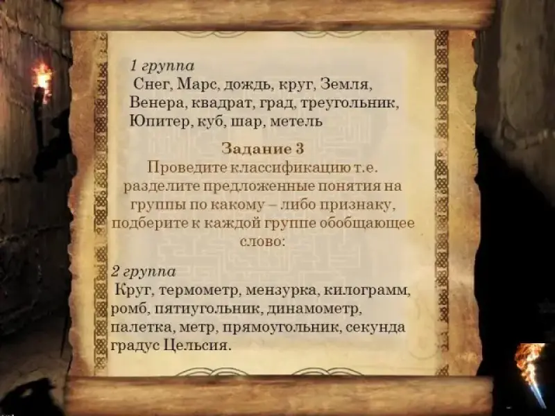 Необходимое оборудование для проведения занятия: компьютерная презентация, компьютерная техника (ПК, мультимедиапроектор, аудиоколонки), раздаточный материал для учащихся и другой наглядный материал, ручки. При работе с презентацией возврат к выбору задания -щелчок в области факела.