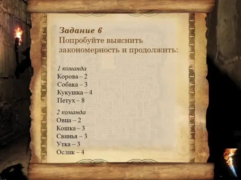 Задание 6: Попробуйте выяснить закономерность и продолжить: 1 команда Корова - 2 Собака - 3 Кукушка - 4 Петух - 8 2 команда Овца - 2 Кошка - 3 Свинья - 3 Утка - 3 Ослик - 4 Задание 7: а) поймите закономерность, найдите недостающее число в каждом столбце и впишите его вместо знака вопроса: 1 команда