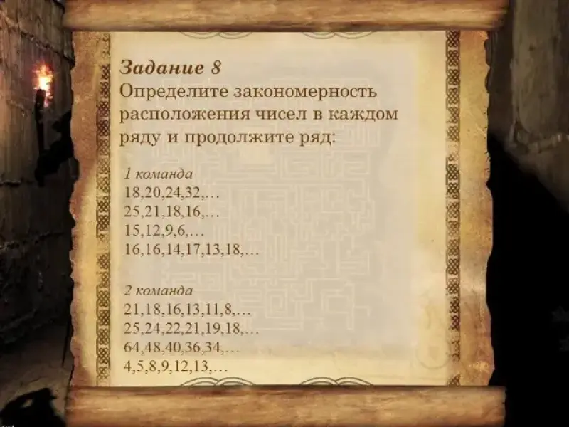 1 команда 18,20,24,32,48 25,21,18,16,15 15,12,9,6,3 16,16,14,17,13,18,12 2 команда 21,18,16,13,11,8,6 25,24,22,21,19,18,16 64,48,40,36,34,33 4,5,8,9,12,13,16 |