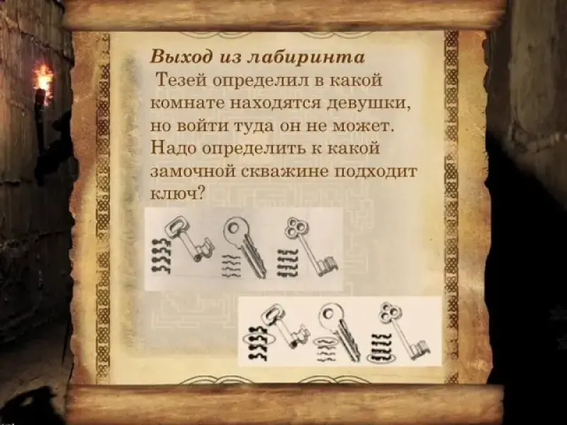 Необходимо посчитать сколько человек находится у Минотавра Выход из лабиринта. Тезей определил в какой комнате находятся девушки, но войти туда он не может. Надо определить к какой замочной скважине подходит ключ?