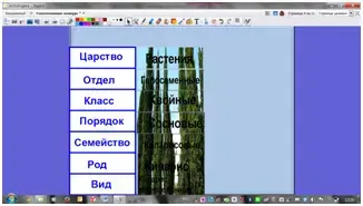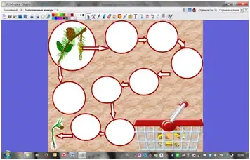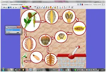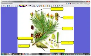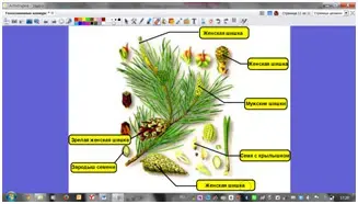 Учитель показывая флипчарт №5, закрепляет знания о размножении голосеменных. Нажимая на маленькую картинку, она появляется в центре с подписями.