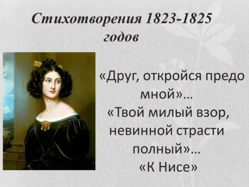 Любовная лирика 1823-1825 годов окрашена в светлые тона, мировосприятие лирического героя радостное, беззаботное. В них женский образ и женская красота несколько обобщены, даже вымышленное нерусское имя - Ниса. Внутреннюю гармонию лирического героя не нарушают еще никакие житейские невзгоды.