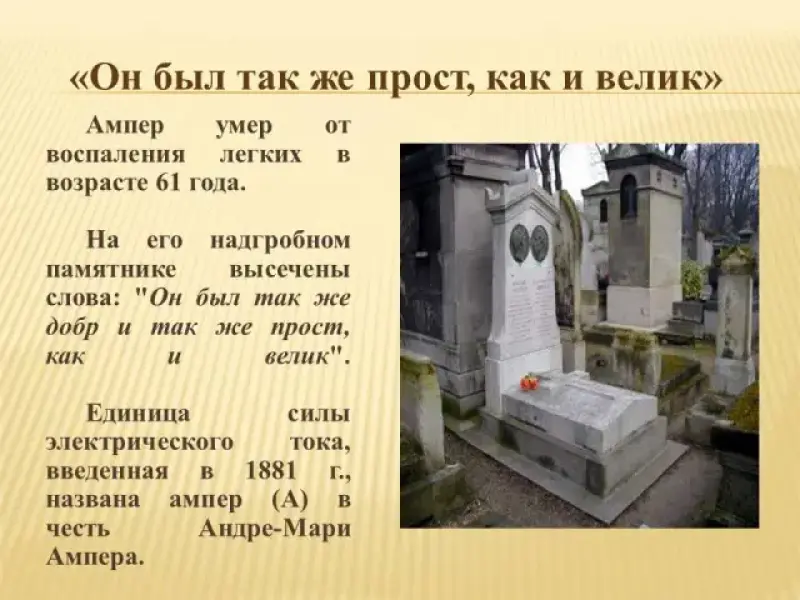 Слайд 9. Ампер умер от воспаления легких в возрасте 61 года. На его надгробном памятнике высечены слова: "Он был так же добр и так же прост, как и велик". Единица силы электрического тока, введенная в 1881 г., названа ампер (А) в честь Андре-Мари Ампера.