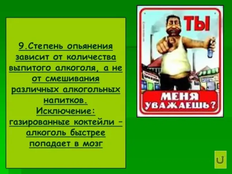 - Степень опьянения зависит от количества выпитого алкоголя, а не от смешивания различных алкогольных напитков. Исключение: газированные коктейли - алкоголь быстрее попадает в мозг.