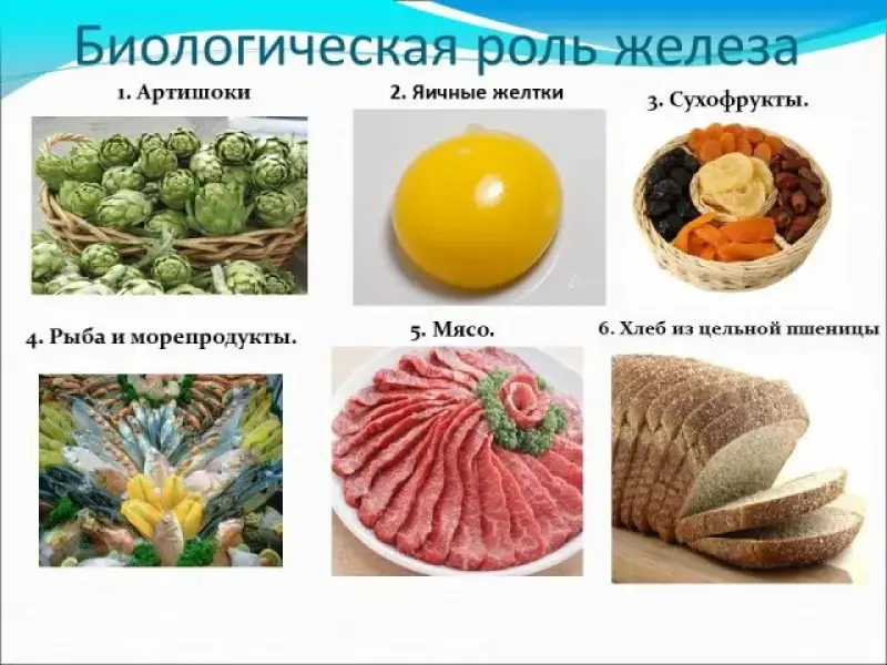 Учитель: предлагает учащимся найти на столах листок с памяткой "Продукты питания, содержащие железо" и спрашивает, о чем пришло время поговорить (о биологической роли железа)