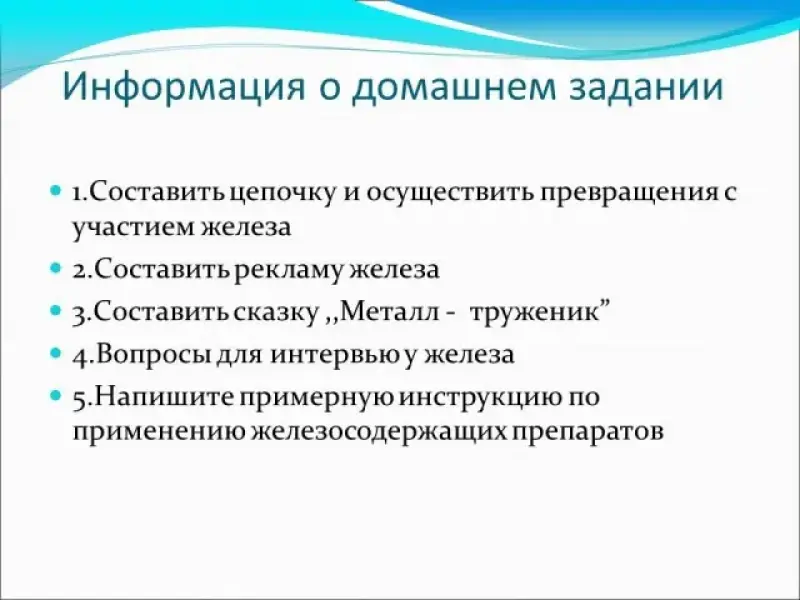 2. составить рекламу железа; 3. составить сказку "Металл - труженик"; 4. составить вопросы для интервью у железа; 5. составить примерную инструкцию по применению железосодержащих препаратов. |