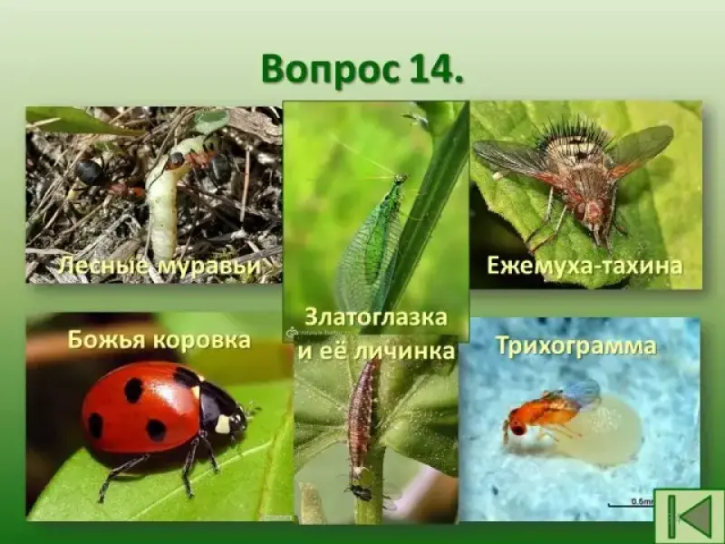Ответ: Это танец пчелы, с помощью которого она сообщает информацию об источнике нектара, указывает его количество, показывает направление полета. - Назовите насекомых-энтомофагов, которых используют для борьбы с вредителями растений.