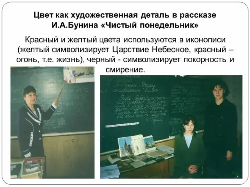 Покажем технологию учебно-исследовательской деятельности на примере рассказа И.А.Бунина "Чистый понедельник" (11 класс). Предметом исследования является цвет как художественная деталь в раскрытии образа главной героини. Класс делится на 3 группы: первая группа выписывает из текста словосочетания со словом "черный", вторая - со словом "желтый", третья - со словом "красный". Результат деятельности оформляется в виде таблицы с комментариями-выводами: красный и желтый цвета используются в иконописи (желтый символизирует Царствие Небесное, красный - огонь, т.е. жизнь), черный - символизирует покорность и смирение. Из чего следует: главная героиня духовно богатая, ее назначение - служить Богу.