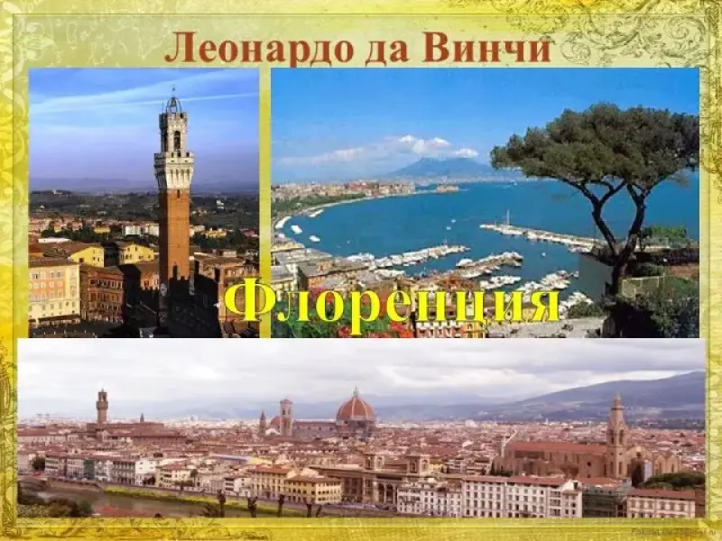 1 слайд - Добрый день, сегодня мы предлагаем вам совершить путешествие в прекрасный старинный город - Флоренцию, на родину самого гениального человека эпохи возрождения, опередившего на много веков свое время - Леонардо да Винчи.