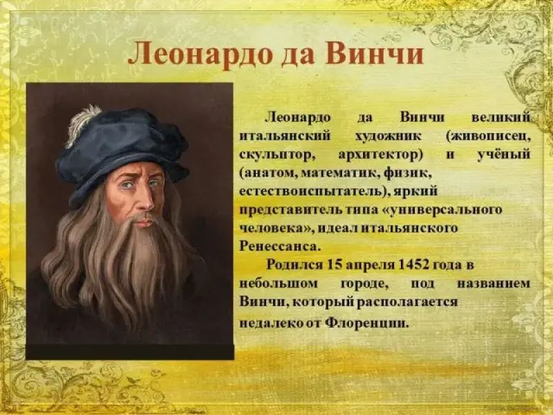 2 слайд - Леонардо да Винчи великий итальянский художник (живописец, скульптор, архитектор) и учёный (анатом, математик, физик, естествоиспытатель), яркий представитель типа "универсального человека", идеал итальянского Ренессанса. Родился 15 апреля 1452 года в небольшом городе, под названием Винчи, который располагается недалеко от Флоренции.