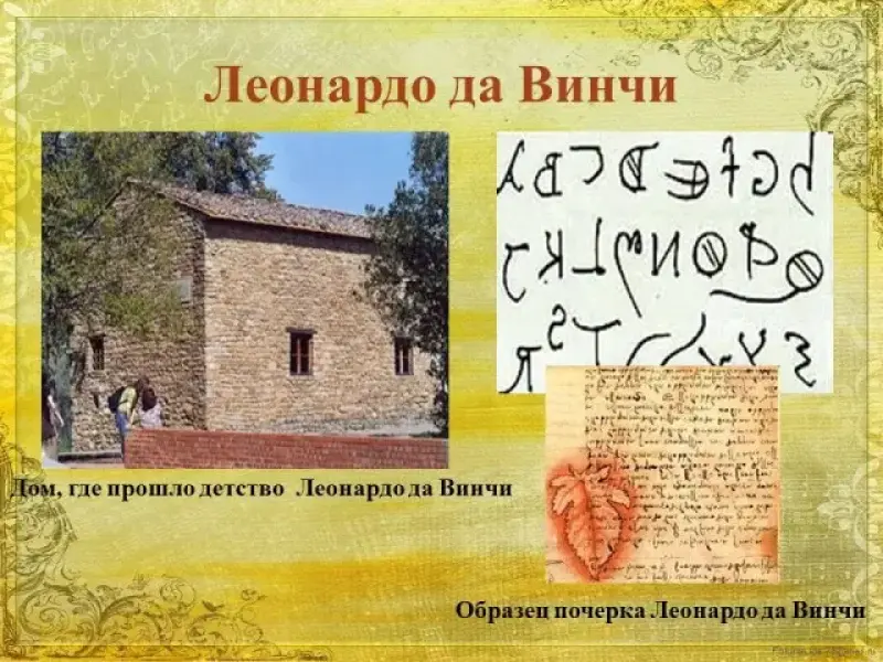 Первые три года своей жизни Леонардо жил с матерью в деревне, а по достижении 3,5 лет, его в свою семью забрал отец, в которой он получает первое начальное образование. Он учиться писать и читать, занимается изучение латыни и математики. Уже в детстве он удивляет окружающих своим почерком, образец которого представлен на слайде. Леонардо был левшой и писал очень своеобразно: справа налево так, что прочитать написанный им текст можно было только с помощью зеркала.