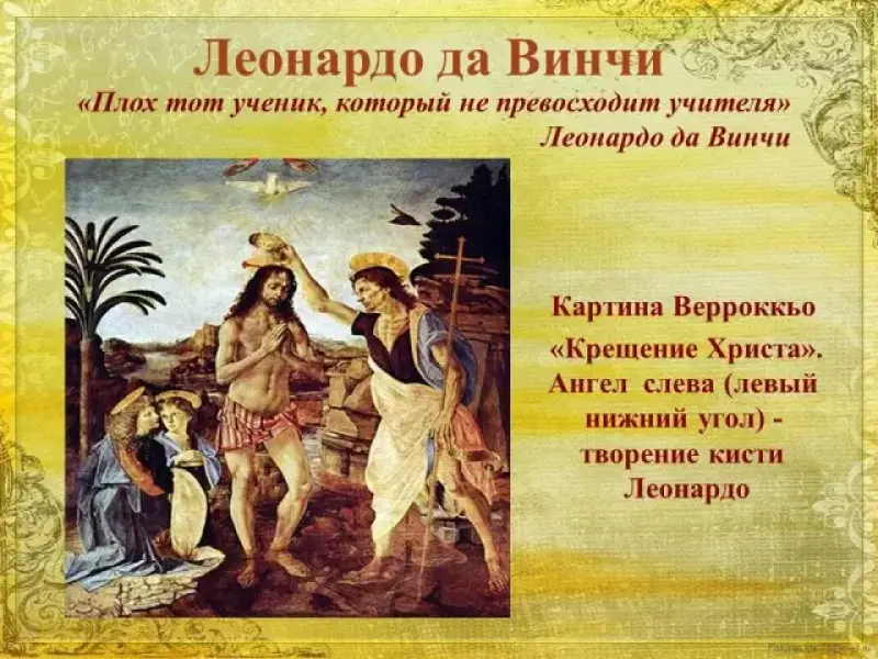 Однажды Верроккьо получил заказ на картину "Крещение Христа" и поручил Леонардо написать одного из двух ангелов, как самому талантливому и старательному ученику. Два ангела, написанные Леонардо и Верроккьо, недвусмысленно продемонстрировали превосходство ученика над учителем. Пораженный Верроккьо забросил кисть и никогда больше не возвращался к живописи.