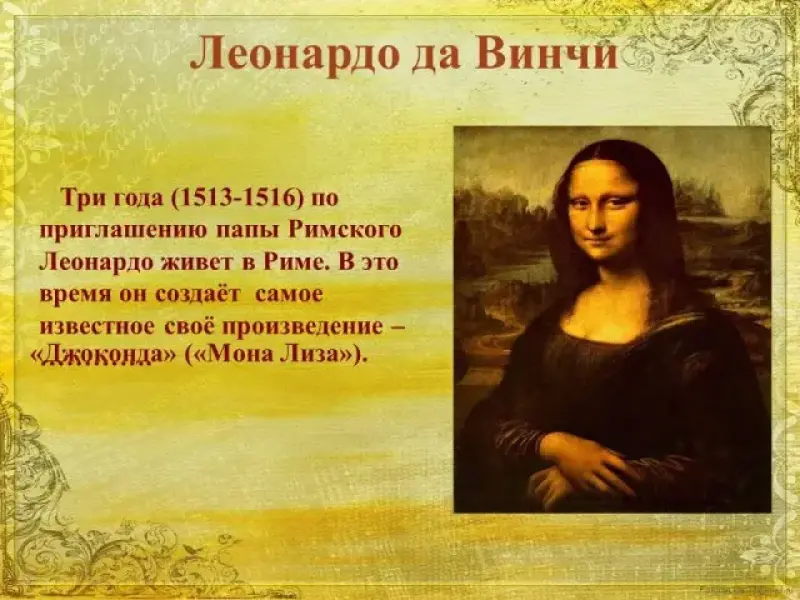 6 слайд - Я готова поспорить, что с этой картиной знакомы многие, может кто-то из вас видел фотографии в журналах, книгах. Вы можете сказать хотя бы одно из названий картины? Обратите внимание на задний план картины. Там мы можем увидеть отдалённые предметы - горы, озеро, и мы понимаем, что они располагаются от Мона Лизы на значительном расстоянии. Это тоже одно из открытий Леонардо да Винчи, так называемая воздушная перспектива (способ изображения удалённых предметов с помощью красок синих и серых цветов и их оттенков).
