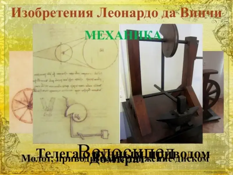 8 слайд - Но Леонардо был не только художником. На протяжении всей своей жизни он постоянно занимался наукой, производил на свет интереснейшие модели различных механизмов и приспособлений, таких как домкрат, посмотрите, ведь его внешний вид не особенно сильно изменился сегодня, телега с ручным приводом, далёкий предок современных автомобилей, велосипед, конструкция которого включает в себя даже цепную передачу, молот, без которого в современном мире не обойтись при вбивании свай и различных железобетонных конструкций.