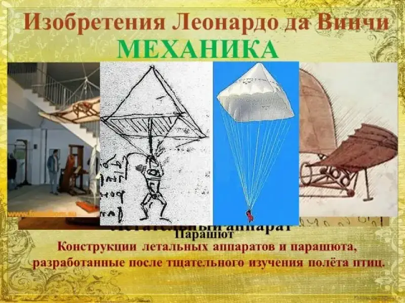 9 слайд - Леонардо да Винчи мечтал научить человека летать и при помощи своей наблюдательности за природой и техническим знаниям, он смог воплотить свою мечту в жизнь. На экране вы видите конструкцию воздушного винта (прототип современных вертолётных винтов), парашюта, который пройдя сквозь века практически не изменился и самое великолепное творение Леонардо - летательный аппарат, очень напоминающий современный дельтаплан.