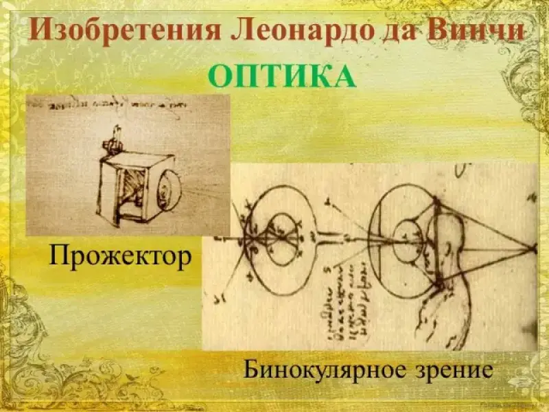 11 слайд - Интерес Леонардо да Винчи в области оптики проявилось в конструкции прожектора (деревянный ящик с круглым отверстием для линзы, в который помещается зажженная свеча, при прохождении света через линзу, освещается наибольшая площадь помещения). Изучал анатомию человека и открыл бинокулярное зрение.