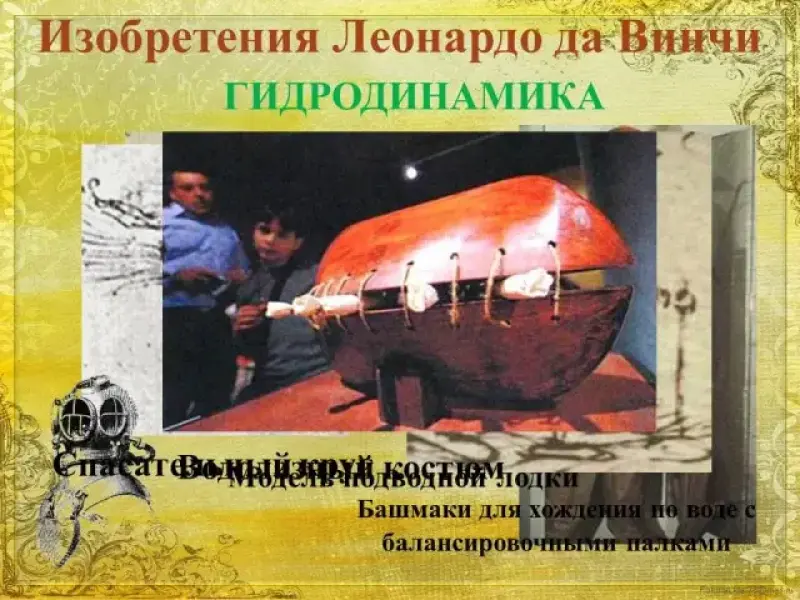 12 слайд - сконструировал водолазный костюм, спасательный круг, башмаки для хождения по воде и модель подводной лодки.