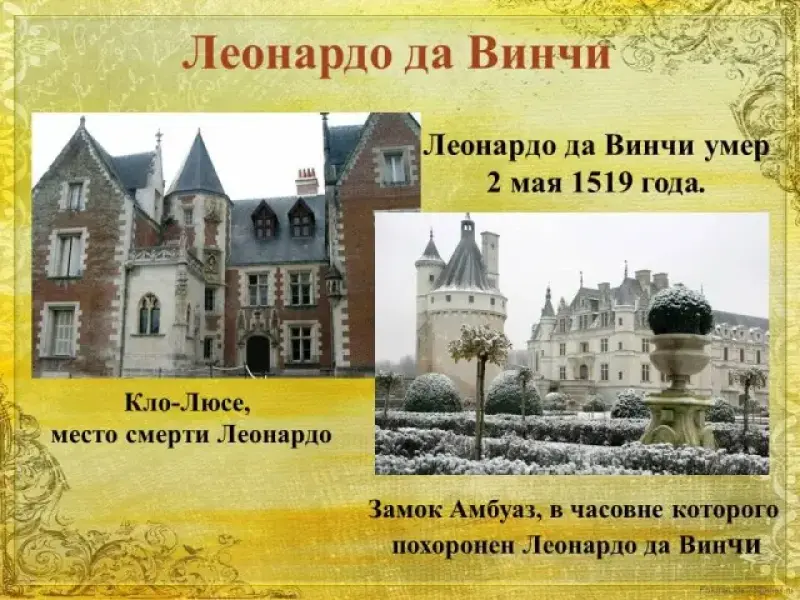 13 слайд - Умер великий деятель эпохи Возрождения в возрасте шестидесяти семи лет в замке Клу, во Франции.